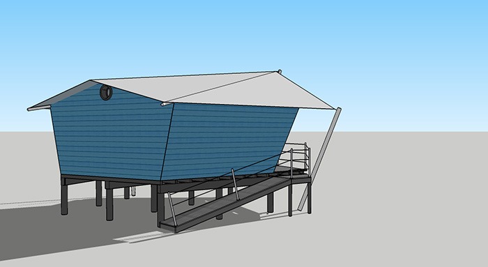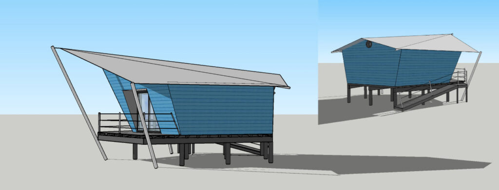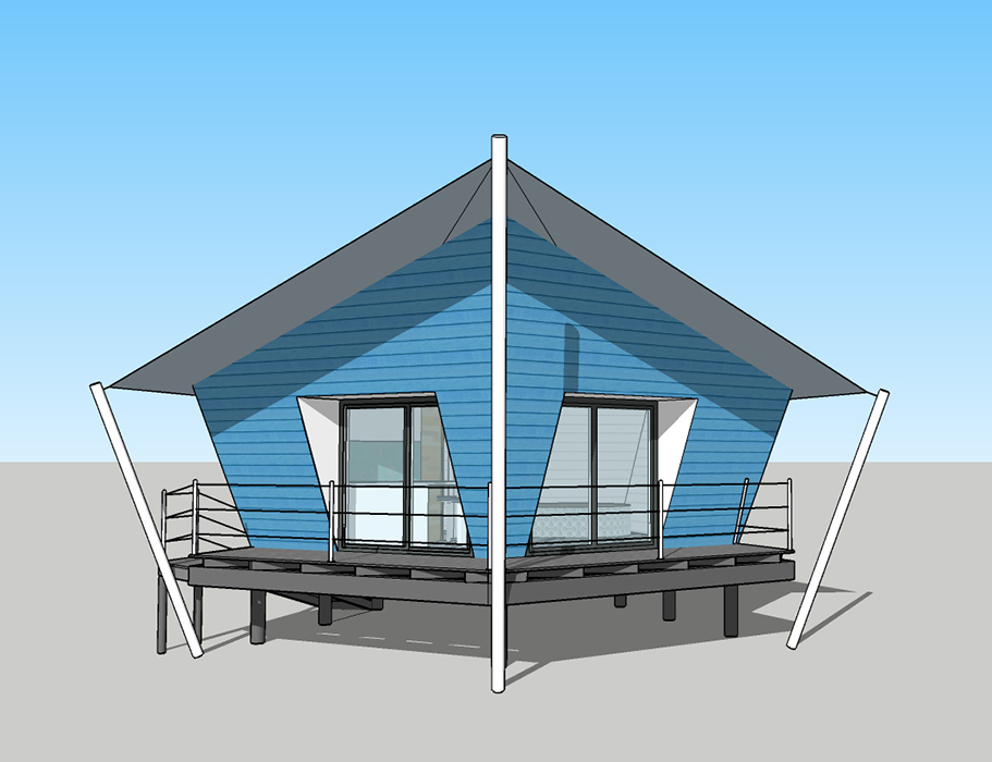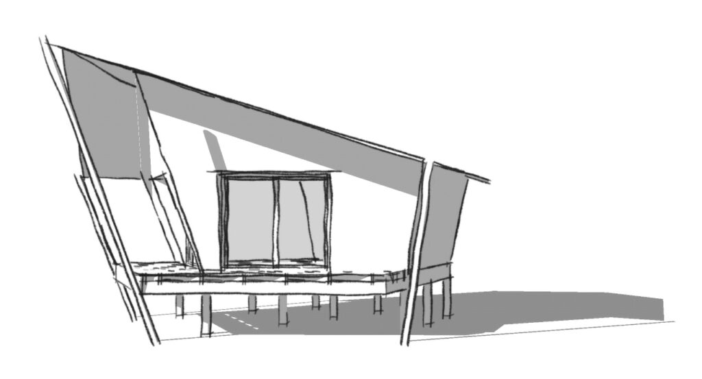 La cabane reprend les lignes d’un bateau stylisé : murs et arêtes déversés, proue inclinée, terrasse ouverte sur le paysage, surélévation sur pilotis pour suggérer le flottement. De larges baies vitrées cadrent la vue sur la chaîne des Pyrénées, tandis que la toiture reprend l’image d’une grande voile tendue, prolongeant l’élan de la construction et renforçant son caractère dynamique et poétique.