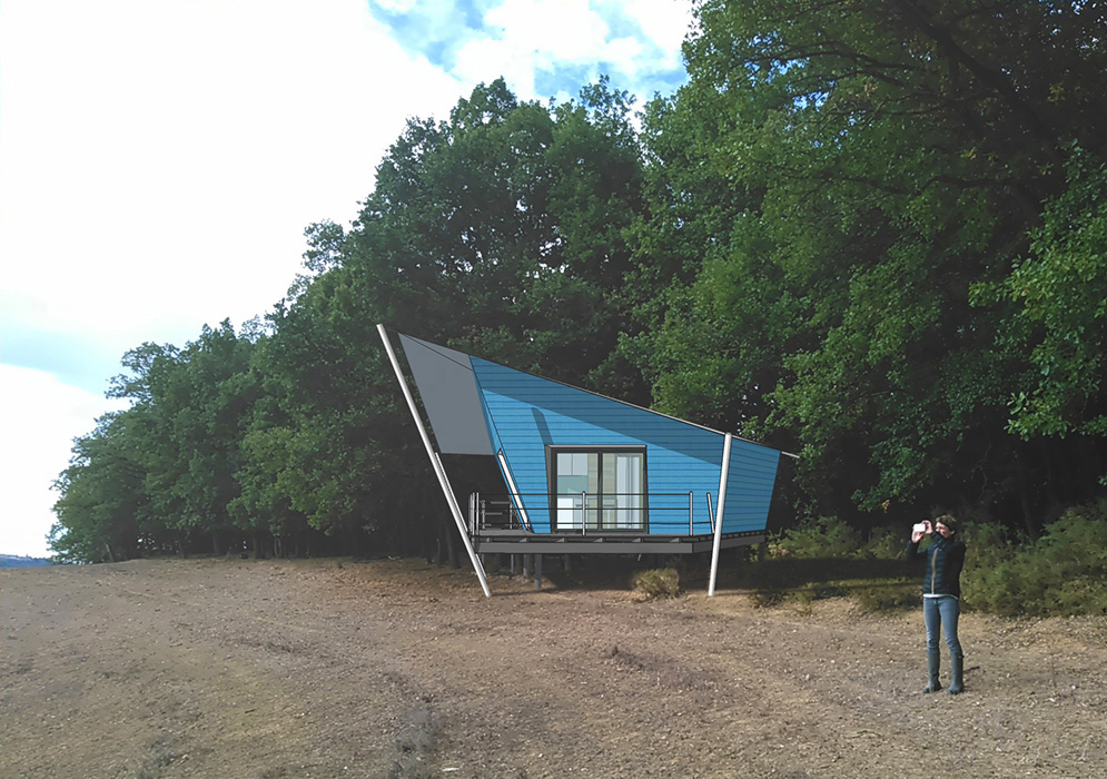 Commandée par un couple d’agriculteurs souhaitant diversifier leur activité vers l’hôtellerie agro-touristique haut de gamme, la Cabane-Bateau prend place dans un site privilégié, en lisière de forêt, avec vue dégagée sur les Pyrénées. Ému et inspiré par une marine accrochée au mur de la maison de mes clients, l’idée d’un « voilier » s’est imposé à moi comme le thème du projet.