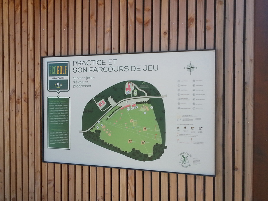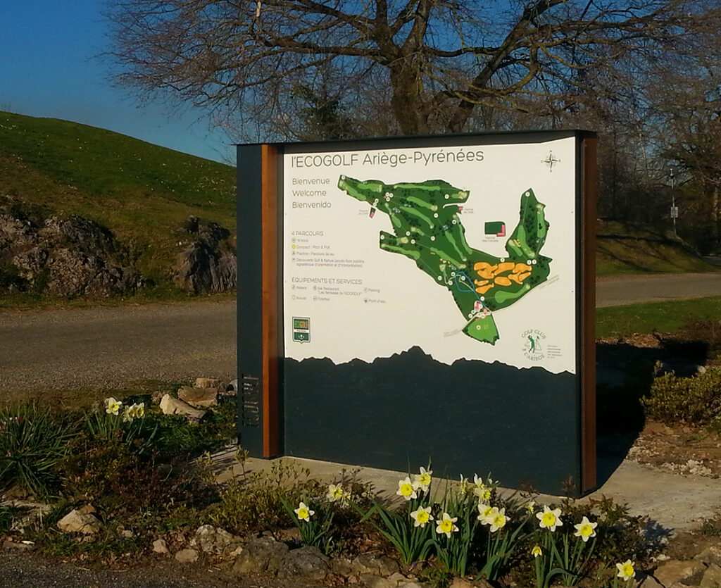 L’Écogolf départemental de l’Ariège s’est engagé dans une démarche écologique, visant à supprimer les intrants polluants et à adopter une gestion différenciée des espaces verts. Dans ce cadre, l’équipe dirigeante a souhaité renouveler l’intégralité de la signalétique et intégrer un parcours pédagogique sur la thématique des espaces naturels environnement. Le projet devait répondre à la fois aux exigences de la nouvelle politique écologique qu’à celle d’un site de prestige.