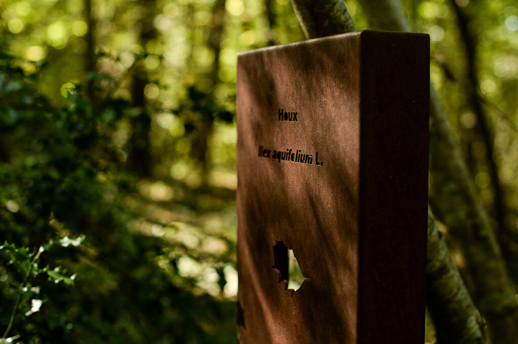 La demande, au-delà de l’aspect pédagogique, était d’apporter une dimension poétique au savoir botanique, faisant écho à l’époque romantique tout en restant inscrit dans la modernité. Dans le respect de cette double intention, j’ai souhaité créer un support de communication simple, efficace et intemporel. La découpe laser, les haïkus (sobres et reflétant une époque de mondialisation où toutes les cultures se mêlent), et le métal symbolisant l’époque des hauts fourneaux, dont l’activité est à l’origine même du château, constituent une alchimie insolite invitant à une expérience immersive où poésie, histoire et nature se rencontrent.