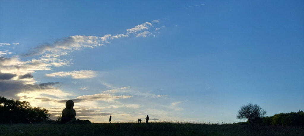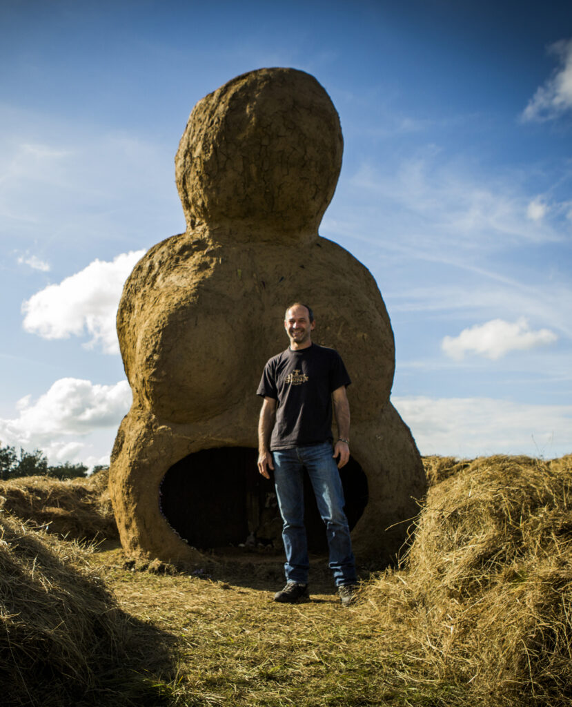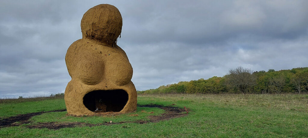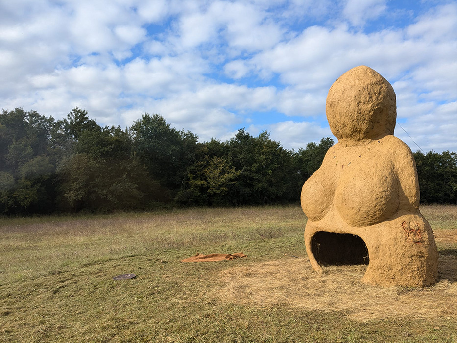 Modelée en argile sur une structure de noisetier tressé, la Vénus associe simplicité et force archaïque. Sa forme puissante et enveloppante évoque autant la protection que l’ouverture. Implantée dans le paysage préservé des coteaux du Comminges, elle se dresse comme un repère symbolique, une figure intemporelle.